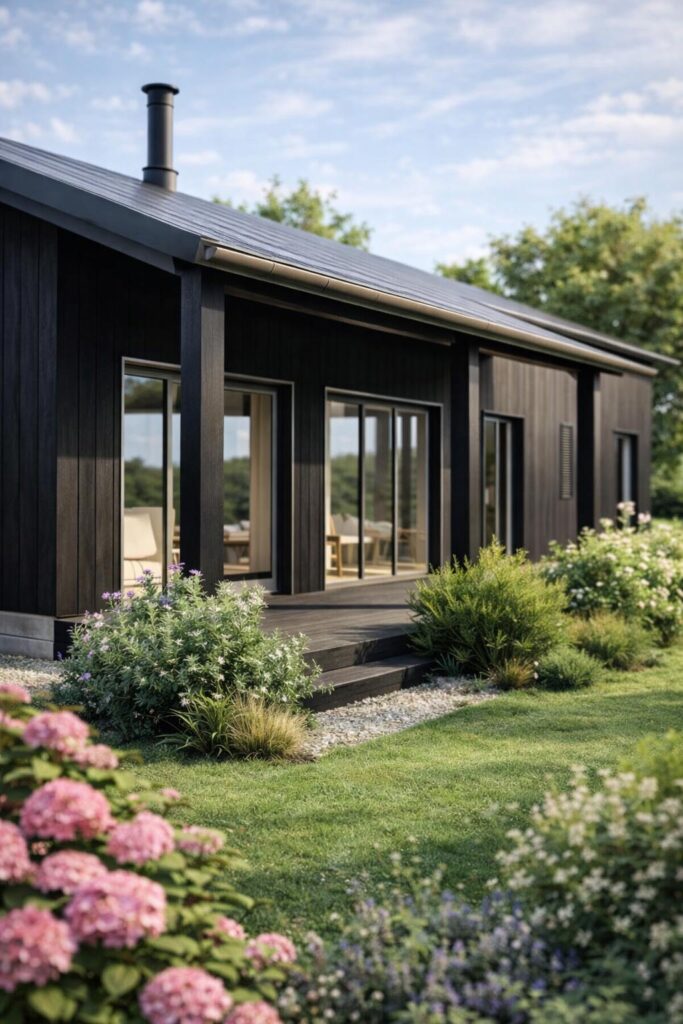 Le choix d’un bardage en bois brûlé affirme le caractère contemporain du projet tout en faisant écho aux paysages de la Dordogne. Inspirée de la technique japonaise du Shou Sugi Ban, cette finition apporte durabilité, profondeur visuelle et une identité architecturale marquée.