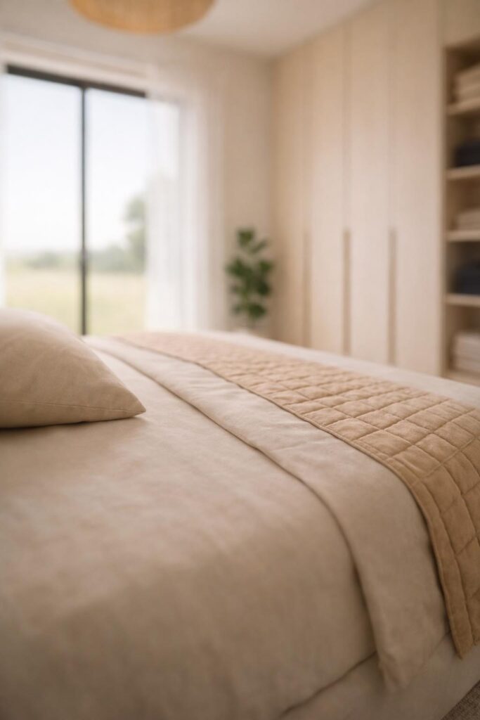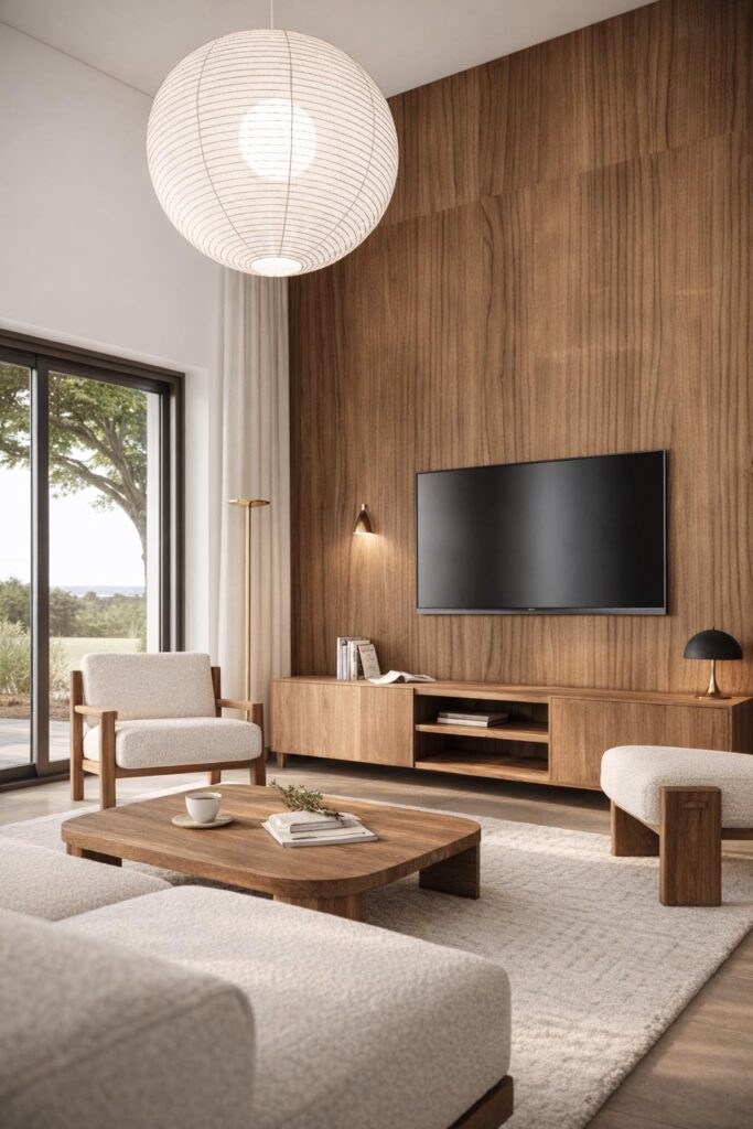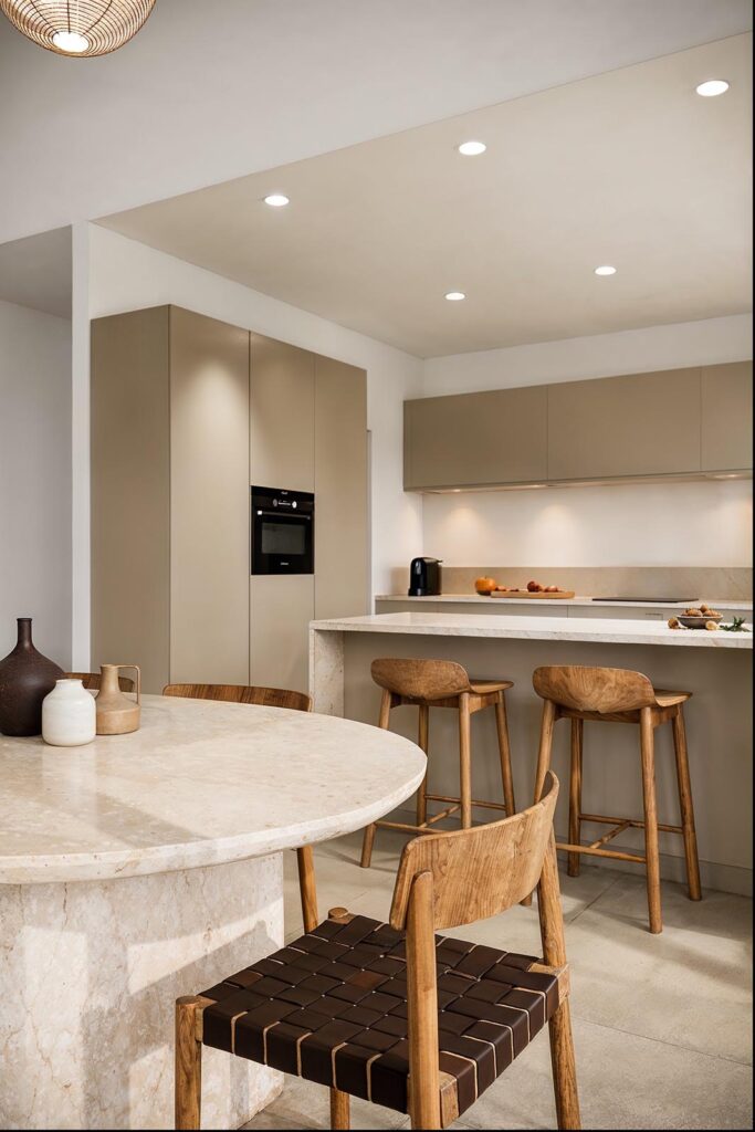 Le projet s’appuie sur une sélection de matières naturelles et intemporelles : bois chaleureux, teintes claires, textiles texturés et lignes épurées. Le salon, la salle à manger et la cuisine forment un espace de vie ouvert, convivial et baigné de lumière naturelle grâce aux larges baies vitrées donnant sur le paysage.
