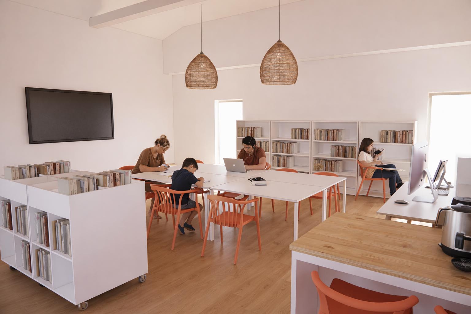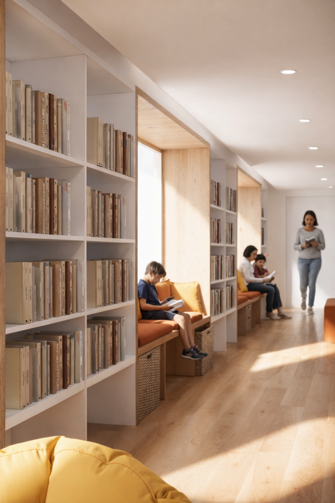Le mobilier bas et modulable structure l’espace sans le cloisonner, favorisant la lisibilité des parcours et la cohabitation des publics. Les assises intégrées en bois clair, les alcôves de lecture et les zones de consultation créent des lieux de pause confortables, propices à la lecture, au travail ou à l’échange.